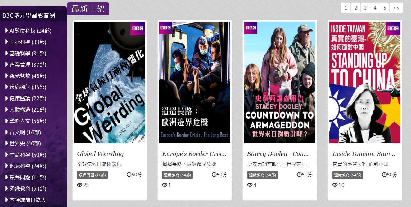 1. AI數位科技(24部) 2. 工程科學(33部)3. 基礎科學(31部) 4. 商業管理(37部)5. 觀光餐飲(46部) 6. 疾病探討(35部)